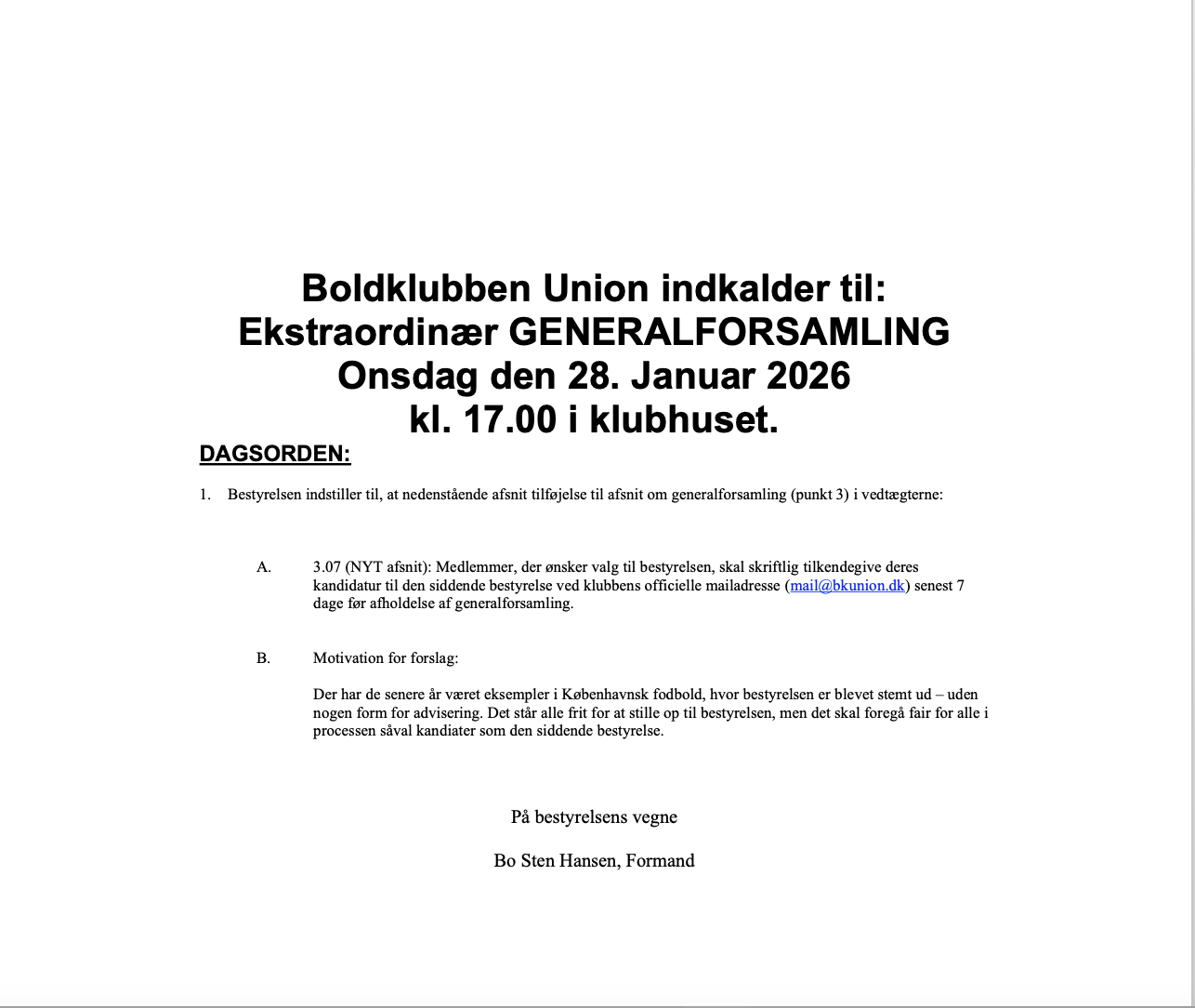 Boldklubben Union indkalder hermed til ekstraordinær generalforsamling: